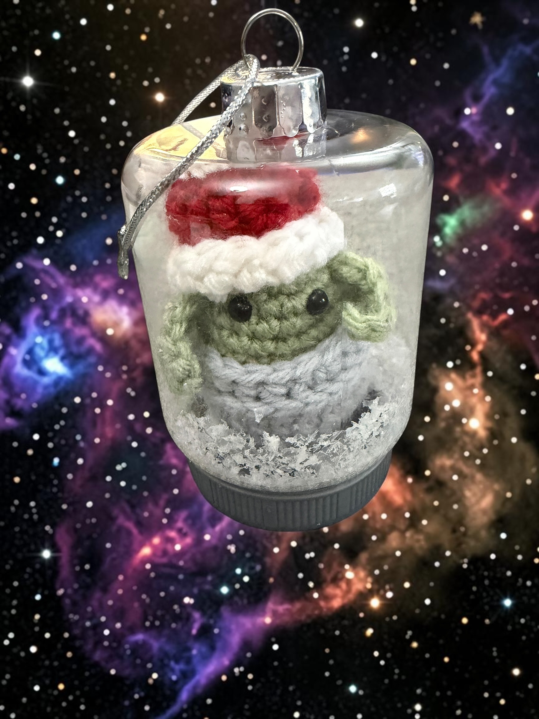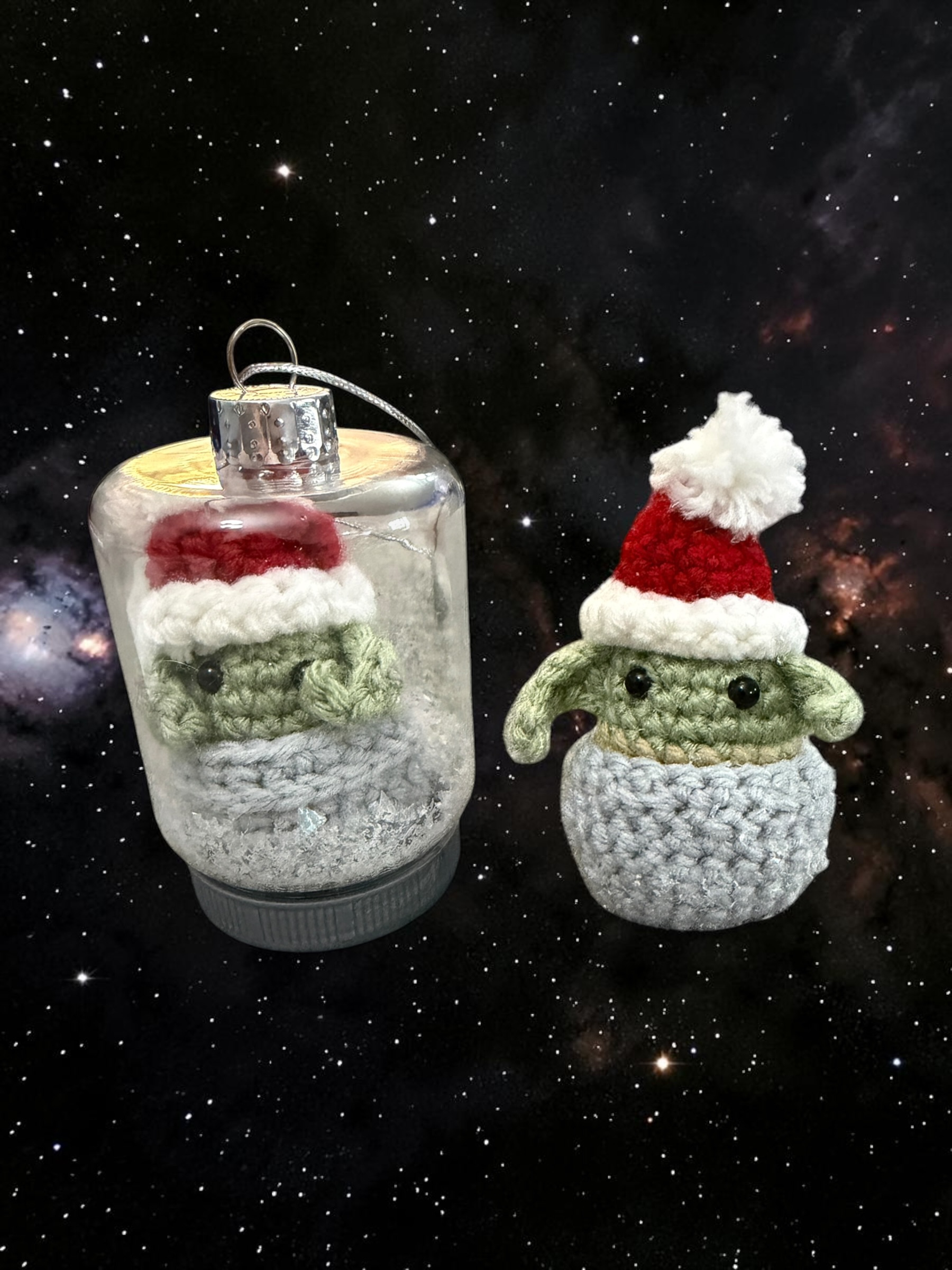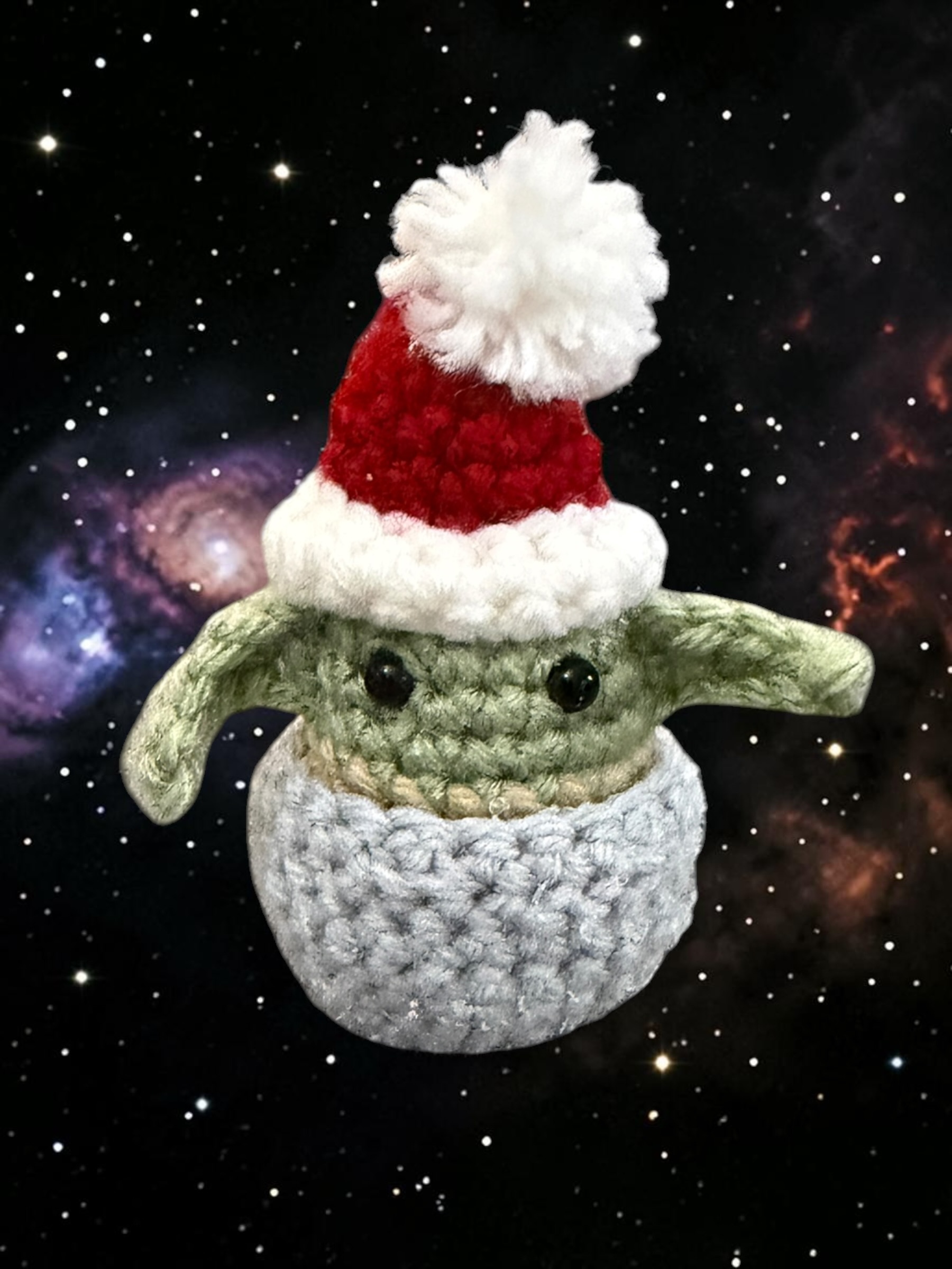 Celebrate the holiday season with the Grogu Christmas Ornament, a delightful crochet piece inspired by the beloved Star Wars character. Perfect for fans of the galaxy far, far away, this ornament adds a unique and whimsical touch to any holiday decor. Whether hanging on the tree or displayed elsewhere, it’s a charming addition to your festive celebrations.